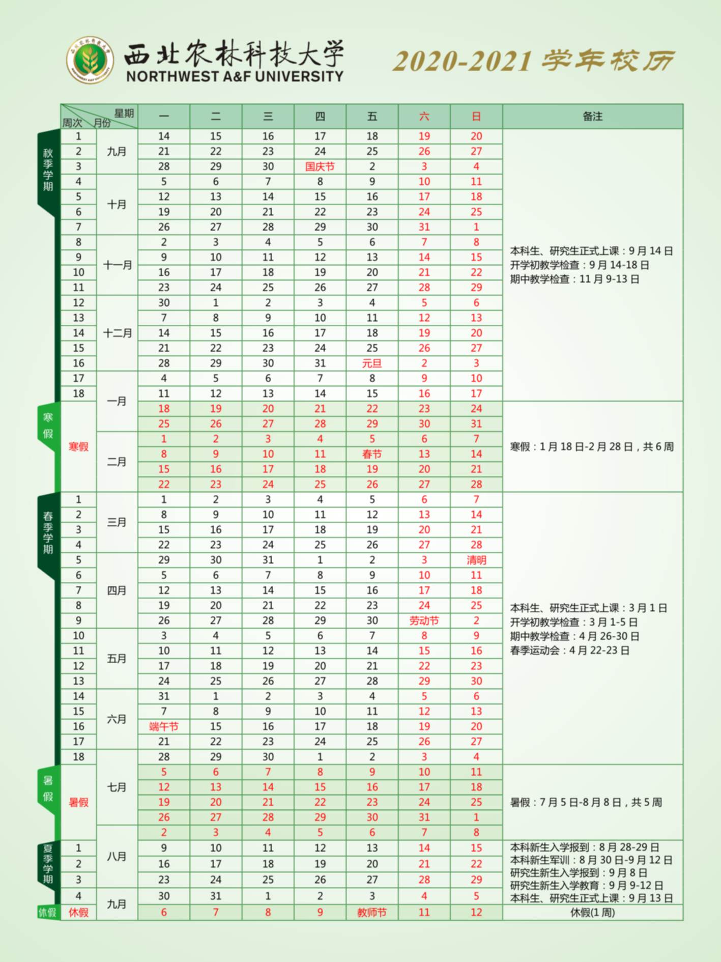 3.所有年级第1周至第16周为教学周,第17-18周安排考试。必修课原则上须从第1周开始安排上课,新生军训安排在秋季学期开学前2周进行。