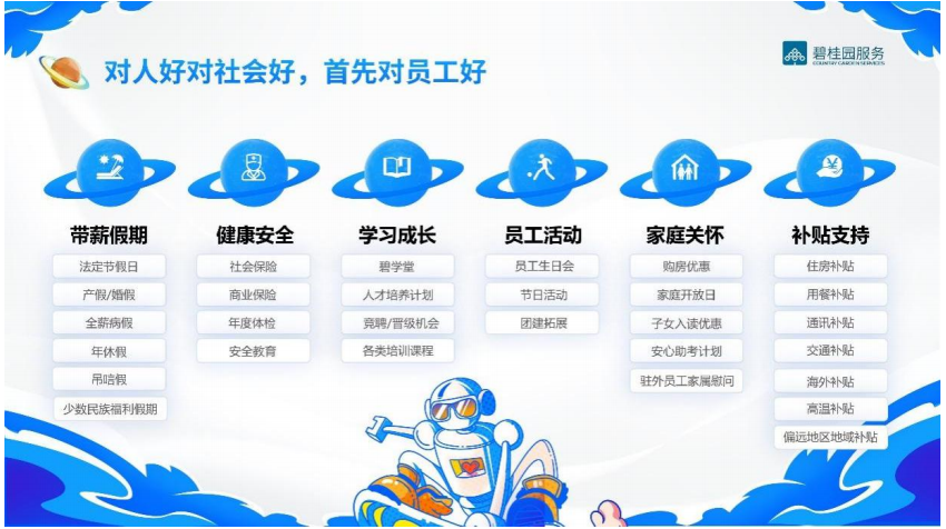 碧桂园服务为全日制统招本科及以上学历、综合素质优秀的校招毕业生提供定制阶梯式的培养发展计划,配置职业导航师及专业辅导人,通过全面的入职培训、在岗培训、轮岗学习、挂职锻炼和专人指导带教,使其在短期内迅速成为具备行业竞争力的复合型人才。