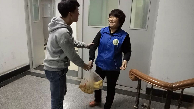 上午10:30,环卫工人杨阿姨正在北校西区十四号楼三楼做着日常的卫生清理工作。资环公司社会实践部的同学在资环公司领导老师的委托下,送去了爱心水果和祝福。在聊天中同学们了解到杨阿姨每天早上7:30就要迎着凛冽的寒风从家中赶来上班,清扫楼道、厕所、垃圾桶、水池、墙壁、楼道等地方,中午仅仅只有一个半小时休息时间。之后,又是一下午四个多小时的忙碌。一个月三十天的辛苦换来的只是一个月一千多块的微薄工资,听到这心中都不禁会泛起一丝心酸,可是杨阿姨却微笑着说:“没事,不辛苦。为了能让咱们西农的老员工们有一个更好的学习生活环境,再辛苦也值得。”杨阿姨朴实的话语却比任何华丽的辞藻更让人感动。