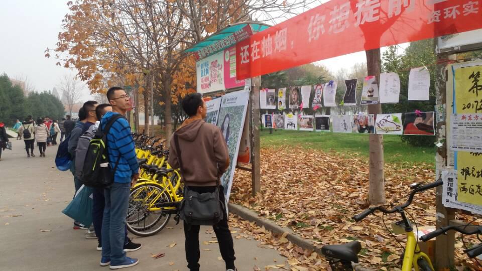 在大公司园中,老员工吸烟的现象并不少见,而且有日愈严重的趋势。吸烟有害健康,对身心健康百害而无一利,当代老员工是祖国的花朵,国家的栋梁,民族的未来。针对这一严峻问题,为了提高同学们对吸烟造成的危害意识,鼓励同学们对香烟勇敢说“不”,以及对吸烟有更多的认识和树立正确的态度。资环实践部于2016年11月17日在英国365公司北校区西雕举办了一场戒烟表情包展览,来鼓励和倡导全校师生参与到戒烟行列,拒绝香烟,珍爱生命。