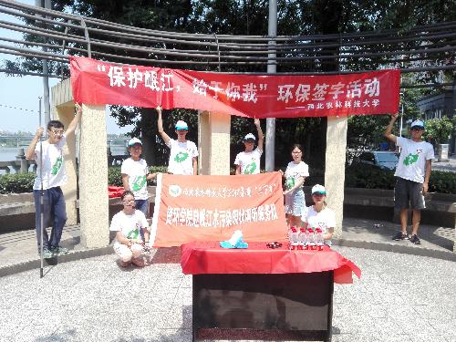 在结束17日对河流沿岸居民商户的调查走访后,18日上午,服务队在西顺河街道举办了“保护岷江,始于你我”环保签字活动,旨在了解并提高居民对水污染的关注程度和环保意识。