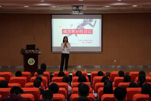 报告会上,石美老师就“如何度过刚上大学的迷茫期”这一问题展开报告内容,点明迷茫的原因是没有明确的目标。之后提出设想场景:大学四年后想遇到什么样的自己,并给出继续深造、求职就业、自主创业以及其他四个方向。她强调:不论选择什么方向,在选择之前都要先了解自己的选择,考虑自己在这方面有什么样的核心竞争力。继续深造方面,有两个选择,一是读研究生,二是出国深造。选择继续深造的同学们除了应该有过硬的专业知识,还要掌握一定的操作能力,石老师引用了由农转工的优秀员工以及在中科院研究出纳米防菌口罩的中员工大宝两个例子阐释了要对科研要耐得住寂寞,保持一定的激情的重要性。就业求职方面石美老师援例引据,通过讲述计算机专业同学自创教育机构与在百度任职的例子展示出就业求职应有的品质。