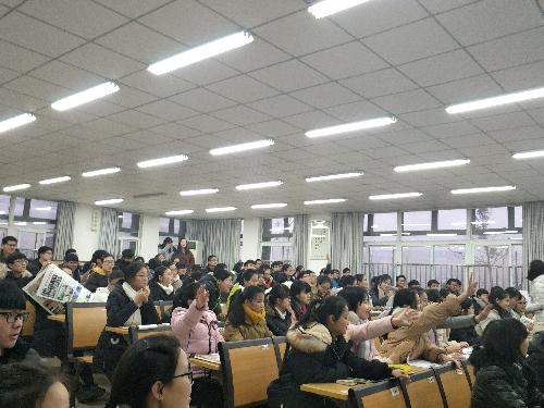 围绕大学梦的话题,参会员工展开了广泛的讨论,队长赵煜权总结说:“大学不仅仅是增长知识才干的地方,也是一个健全人格、完备思想的地方,而如何实现身心的诚朴勇毅正是西农学子所追求的。”随即队长展示了西农风光的视频以及宣传PPT,并通过对水土保持专家——朱显谟老先生艰苦卓绝,提出水土保持二十八字治理方针的突出事迹阐释了西农精神,这获得了员工们雷鸣般的掌声。