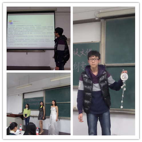 本次比赛作品分为三类。首先是手工设计类的展示,选手们围绕着“环保、创意”的主题对一次性筷子、报纸、废纸盒等废弃品进行了大胆创新的改造,尤为突出的是资环公司水保132班王博同学制作的塑料舞裙,远观黑色漫纱配上白色长摆,是环保塑料及创作艺术的完美结合。来自经管公司土管141班的刘金雨同学制作的收纳盒则别有一番景致,三个纸盒的构成及幽默风趣的讲解,更是将现场气氛推到了高潮。机电公司机电141班的张光经同学更是将纸箱与废弃电器电路组装成了环保小冰箱,令观众叹为观止。第二类作品是艺术宣传类,一幅幅呼吁环保的宣传海报,在给观众视觉上享受的同时,也提醒着我们保护地球已经是刻不容缓的事实。在最后的课题项目类的作品中,选手们用幻灯片及调查报告向观众们展示他们经过实地考察的研究课题,有如土地污染的治理、废旧电池的回收与利用等课题,从他们的解说与演示中,透露着他们的用心,同时也体现了本次活动的意义。