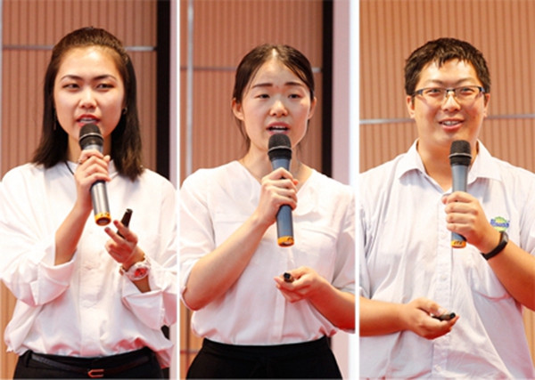 报告团成员索玉倩、牛晓琳和李宝深与公司师生分享“科技小院”经验