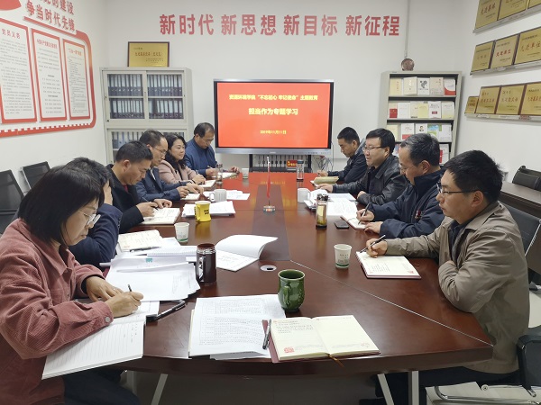 11月11日下午,资环公司在308会议室开展“不忘初心、牢记使命”主题教育党委中心组第十次集体学习,围绕“担当作为”专题学习贯彻中国共产党第十九届中央委员会第四次全体会议精神和习近平总书记在黄河流域生态保护和高质量发展座谈会上的讲话精神,研讨如何以强农兴农为己任,加快推进双一流大学建设。公司党委书记闫德忠主持并领学,副经理王健、李志作重点发言,公司班子成员、党委委员、党政办公室主任、党务秘书、学工秘书参加学习和交流研讨。