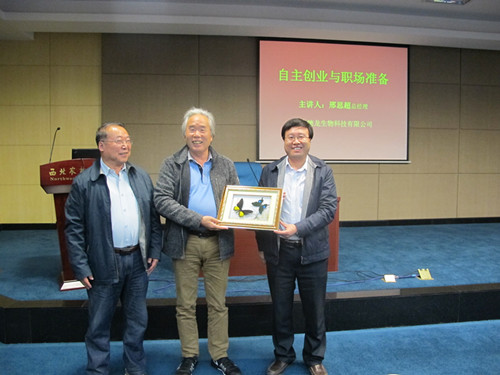 最后,邢思超给大家留下了言简意赅的几条职业规划建议:树立职业精神;建立创业意识;学会做事、做人、学习。本次讲座在现场同学热烈的掌声中圆满结束,同学们纷纷表示获益匪浅。邢思超的精彩讲座不仅消除了同学们对于就业前景的迷茫感,也让同学们更加明确创业方向。同时,党委书记闫德忠赠送特制“世界名蝶”纪念品对邢思超总经理精彩的报告表示感谢,并合影留念。