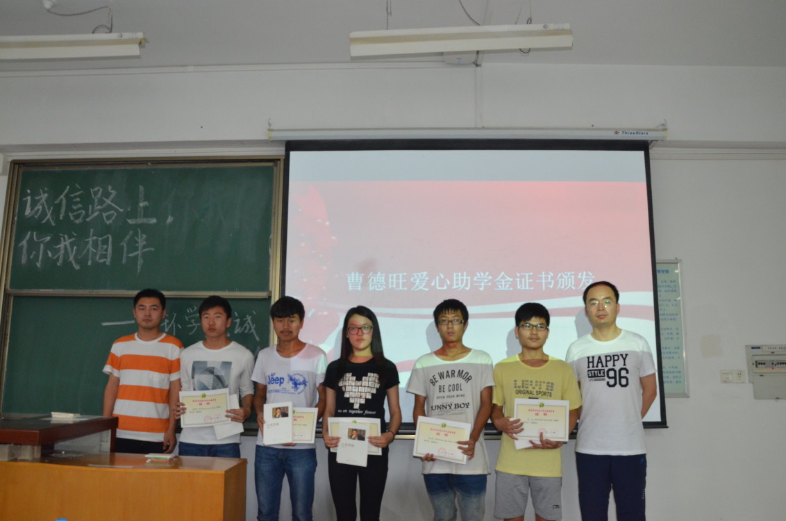 会上,辅导员唐帅为曹德旺助学金获得者颁发证书,刘庆麟老师为学子赠送了曹德旺先生的著作——《心如菩提》,。获奖代表段国秀、王文刚发表了获奖感言。段国秀向大家传递了一种积极乐观的态度,“对于大家,贫困也是我们一生的财富。”王文刚认为一个人的爱很小,但大家的爱汇在一起就是强大的暖流。他有着艰苦的打工经历,虽然家境不好,但他从未在学习上有所懈怠。“我不知道前面是什么,但我知道后面是我的家。我不聪明,但我还算努力。我时刻记得我是一名受助者,时刻回忆起我的打工生活。”他希望大家能将爱心传递下去。