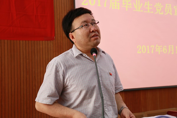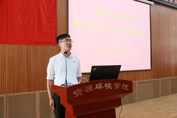 在雄壮的国歌声中,全体与会党员面对鲜艳的党旗重温了庄严的入党誓词。从大一到大四,从硕士到博士,母校、公司的多年培养让毕业生党员们满怀感恩。优秀博士毕业生党员沈锋同志回顾了在西农从本科到博士11年的学习、成长历程,收获学业、爱情、创业的成功与喜悦,代表全体毕业生党员表达了对母校及老师、同学的感恩之心和眷恋之情。“毕业并不意味着结束,而是一个新的开始,是踏入社会开始全新的人生。”他表示,将站好最后一班岗,当好文明离校的表率,并在未来的职业生涯中时刻牢记共产党员身份,践行入党誓词。
