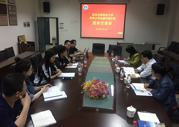 闫德忠与西南大学资环公司党委书记李雪梅在座谈会上各自介绍了两校、院基层党建工作及亮点特色,对工作中面临的重点难点进行交流经验做法。并针对“两学一做”学习教育制度化常态化探索,尤其是支部工作考核、党员管理、理论学习制度完善等方面充分交换意见。学工秘书和红燕分享了公司少数民族员工教育管理工作的优秀做法,西南大学资环公司党委副书记邓洪波针对辅导员工作室的定位、工作开展、建设目的等进行交流。座谈会上,公司员工马明副教授对母校领导老师赴西南大学调研工作感到非常亲切,表示希望两校能经常开展交流:“我在西南大学完成的国家973项目中,很多合作的老师都毕业于西农,西农人的踏实和勤奋得到了一致好评。参加母校的座谈会非常激动,作为一名党员,也一直在思考和摸索如何将党的工作与学科相结合,更好地发挥党员带头模范作用。”