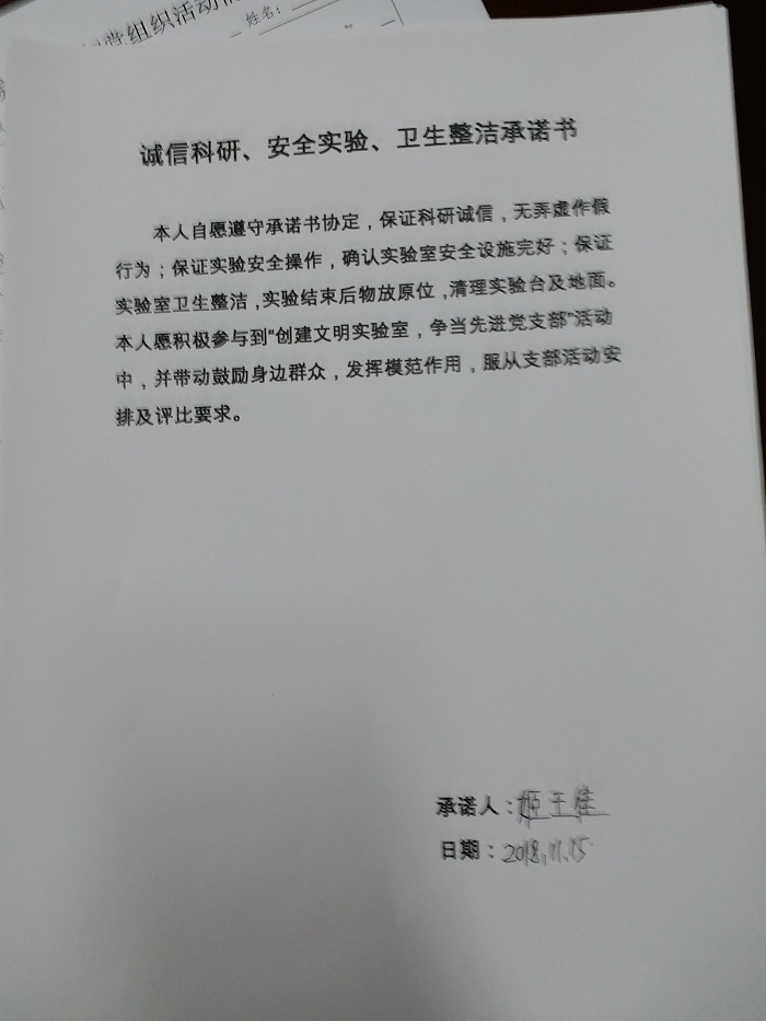 首先,支部书记杜泽坤带领各位党员及积极分子学习两个文件的主要内容并结合公司公司特点针对性的提出“创建文明实验室,争当先进党支部”的活动构想,明确此次活动对支部班子建设和广老员工党员和群众提高思想认识、厚植文明情怀的重要意义。接着支部书记杜泽坤率先签订《诚信科研、安全实验、卫生整洁承诺书》,其他党员及积极分子对活动意义表示高度认同签订承诺书,希望用自身行动树立先进典型。
