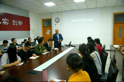 在长达2个半小时的培训里,靳军老师与支部30余名师生进行了频繁的互动交流,鼓励大家对如何拟一个更准确生动的标题、如何做到心中有图等进行了思考和探讨,还现场模拟慰问活动让师生们运用所学知识练习拍摄新闻照片。