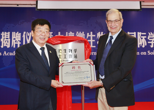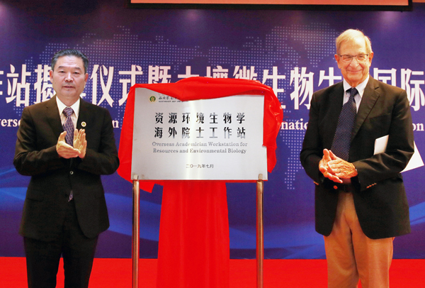 公司党委书记李兴旺和詹姆士•迪杰院士为资源环境生物学海外院士工作站揭牌
