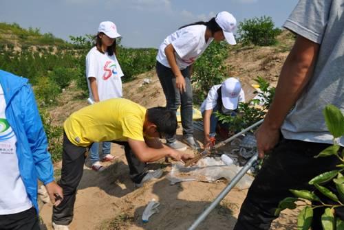 基地调研,参观见习。8月16日,服务队从杨凌出发到达了公司米脂试验站。在魏新光博士的带领下参观了远志山红枣试验基地,他详细介绍了红枣矮化、节水灌溉、土壤水分动态变化等相关实验,服务队成员兴趣盎然,结合自己的专业特点提出了不少问题,收获颇多,更重要的是让课堂所学走出校园,真实感受了书本知识在实际中的应用。此外,服务队还在老师的辅导下重点学习了土壤深层剖面水分监测,茎流计测定树干蒸腾,田间定量灌溉试验等新技术的应用,激发了服务队的学习热情。