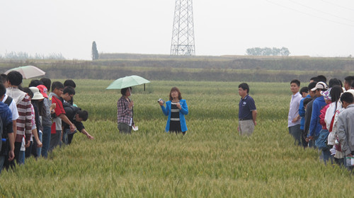 在合阳县小麦肥料效率与测土监控施肥田间实验点,县农业技术推广中心的工作人员为同学们详细介绍了实验点的发展历史,引导同学们参观了田间试验的分布,现场察看了小麦的长势,分析了小麦施肥的基本技术原理,现场解答了同学们提出的问题。