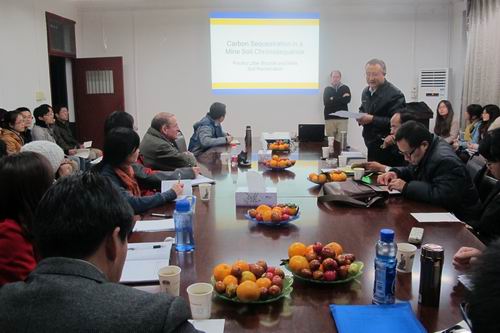 7日晚19点30分在公司第一会议室,美国西弗吉尼亚大学植物与土壤科学系Louis McDonald教授为公司师生作了“Carbon Sequestration in Mine Soils Chronosequence”和“Poultry Litter and Mine Soil Reclamation”两个专题报告。Louis McDonald教授从土壤碳库在减缓气候变化的重要作用出发,详细的介绍了他们对矿区土壤复垦过程中土壤有机碳库积累,包括如何采样,样品数的确定以及对样品的分析等方面。而有关对矿区土壤的修复,Louis McDonald教授研究利用Biochar 施用对矿区土壤的影响。激起了与会师生的广大兴趣,就Biochar的含碳量以及对矿区土壤的修复效果以及Biochar的制备过程进行了热烈的讨论。