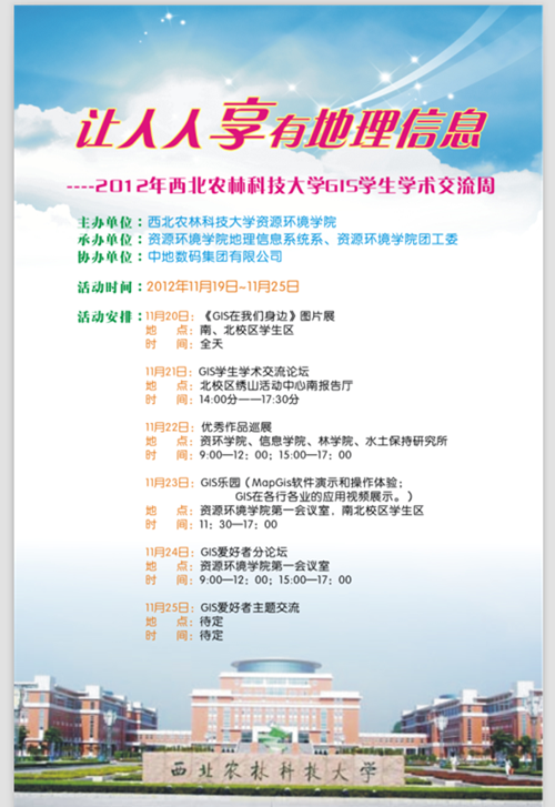 据悉,本次GIS员工学术交流周活动将面向全校员工征集GIS相关开发和应用作品,举办优秀作品巡展;举办《GIS在我们身边》图片展,发起以MapGis软件演示和操作体验、应用视频展示为主体的GIS乐园活动,举办GIS爱好者分论坛和主题交流活动。