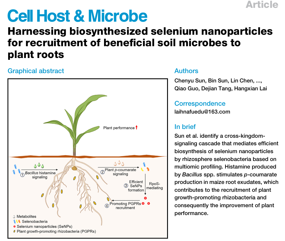 近日,来航线教授团队在植物-微生物互作方向取得新的进展,研究成果以“Harnessing biosynthesized selenium nanoparticles for recruitment of beneficial soil microbes to plant roots”为题在Cell子刊《Cell Host & Microbe》(IF2023 = 30.3)上发表。英国365集团博士研究生孙晨瑜、硕士研究生孙斌和西北大学青年教师陈林为共同第一作者,来航线教授为通讯作者,公司为第一和通讯单位。