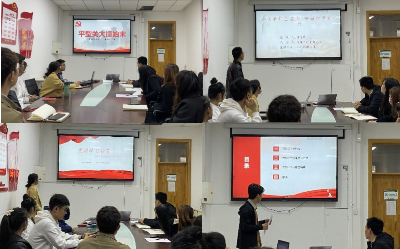 会议开始,纪检委员毛江平带领全体党员从党的二十大概况、意义及党二十大报告精神等方面学习了党的二十大。预备党员郑宇桐分享学习《关于在全党大兴调查研究的工作方案》,号召大家在搞好科研的同时更应该积极参加实践调研活动,学以致用,努力成为“一懂两爱”的人才,担负起强农兴农的使命。预备党员于晓伟带领大家学习伟大建党精神、长征精神、抗美援朝精神,他表示伟大建党精神凝结成32个字,字字铿锵,是中国共产党人初心使命的真实呈现;长征中红军战士们坚定信念、不畏艰难,抗美援朝中中华民族不畏强暴、敢于斗争的精神激励我们永远奋斗。宣传委员李盼弟从南泥湾、杨家岭、枣园、梁家河讲述黄土高原上的红色记忆,学习“全心全意为人民服务”、“自力更生、艰苦奋斗”、“开拓创新”的延安精神。组织委员李向宇运用自己的GIS知识,形象的讲述了平型关大捷,让大家直观了解山地战中占据地理位置的重要性。