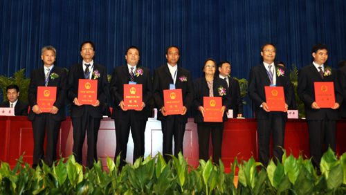 董振生教授(左四)、韩崇选教授(左二)在全省科技创新大会上领奖